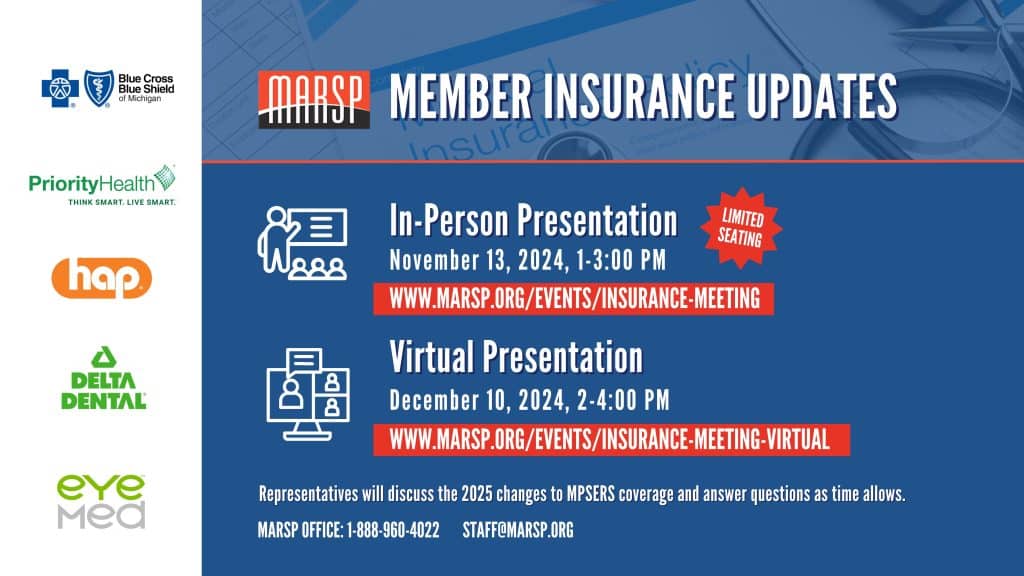 - Not a MARSP member? Explore the 2023 insurance issue (click here) as an example of the valuable information our members receive. It’s packed with key updates on MPSERS insurance plans, designed to keep retirees informed and prepared. If you find it helpful, consider joining MARSP for access to resources like this all year long! Click here to join MARSP and begin your VANGUARD subscription!