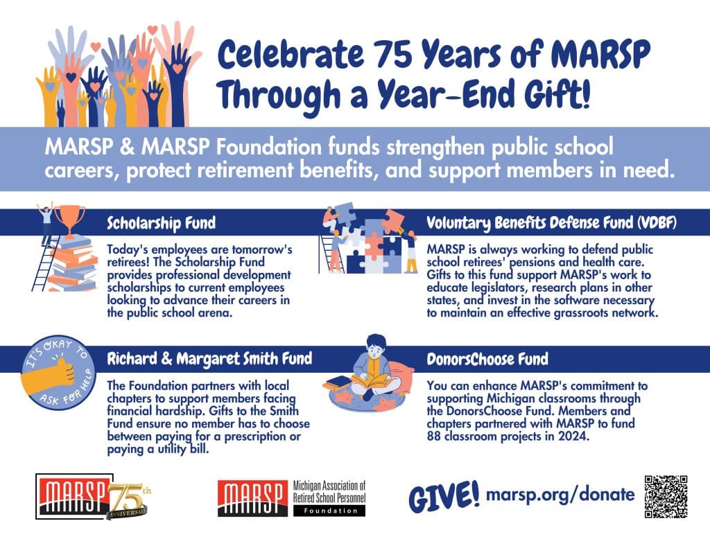 FOUNDATION ENDOWMENT FUND: The Endowment Fund creates a lasting resource to support MARSP’s mission. Contributions are carefully invested, with only the interest used to fund the Foundation’s initiatives. Every gift helps grow the principal, ensuring sustained support for Michigan’s public school retirees. Consider naming the Endowment Fund in your estate plans to help secure MARSP’s future! Contact us to learn more about planned giving.