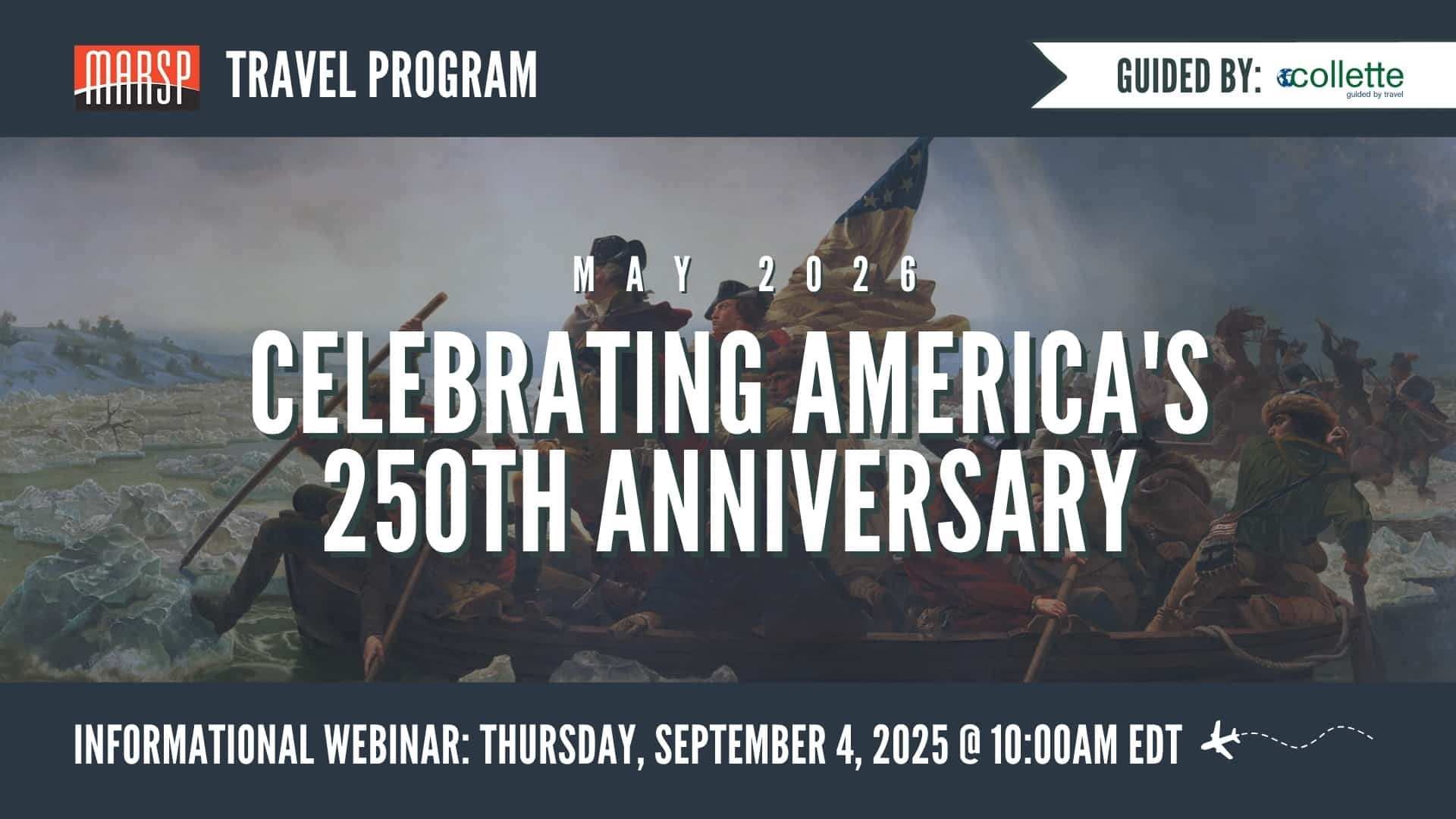 ![]() | Celebrating America's 250th Anniversary | May 11 - 19, 2026 | 2 | Celebrating America's 250th Anniversary Webinar Replay | Celebrating America's 250th Anniversary booking | Book by 11/11/25 |