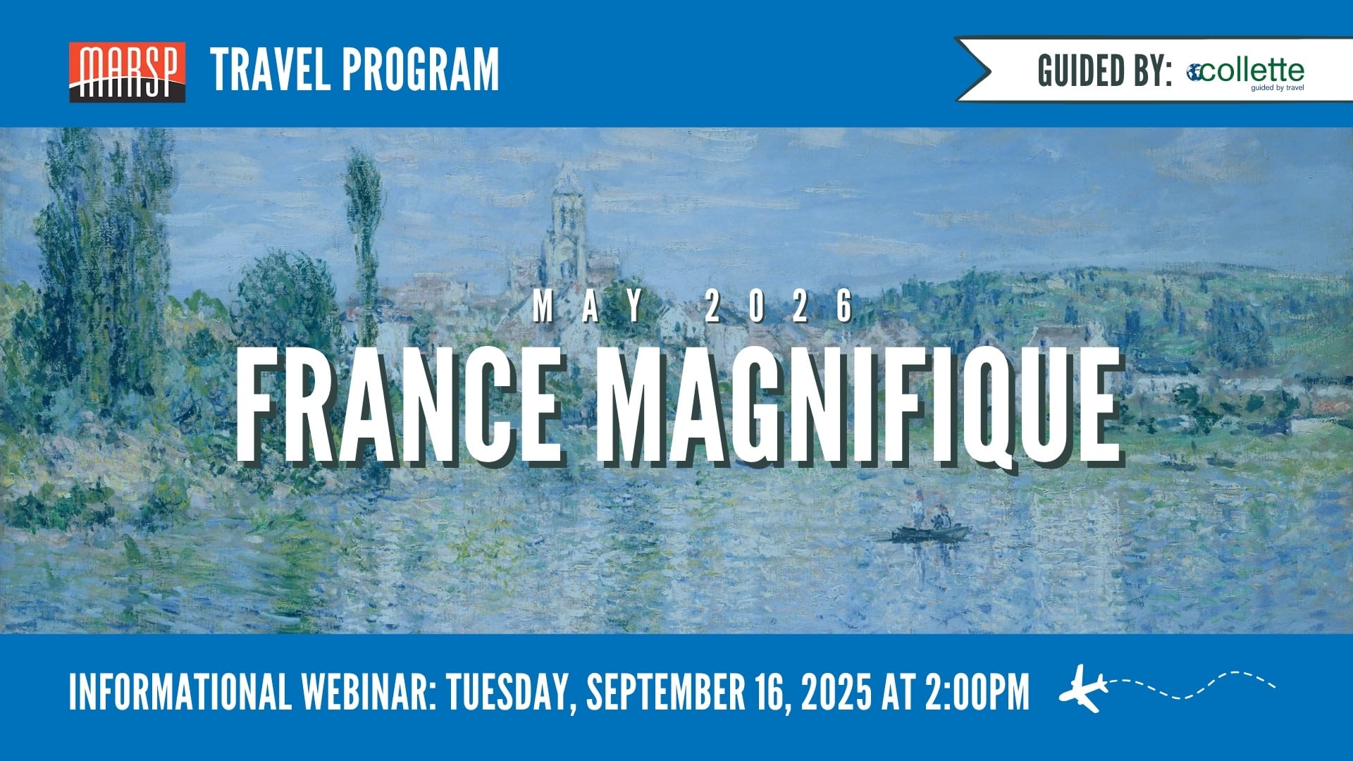 The annual Travel Program Guide gives a comprehensive view of each upcoming destination all in one place! Become a MARSP member to receive future issues of this catalog. Members must also indicate “Travel Interest” in their communication preferences.